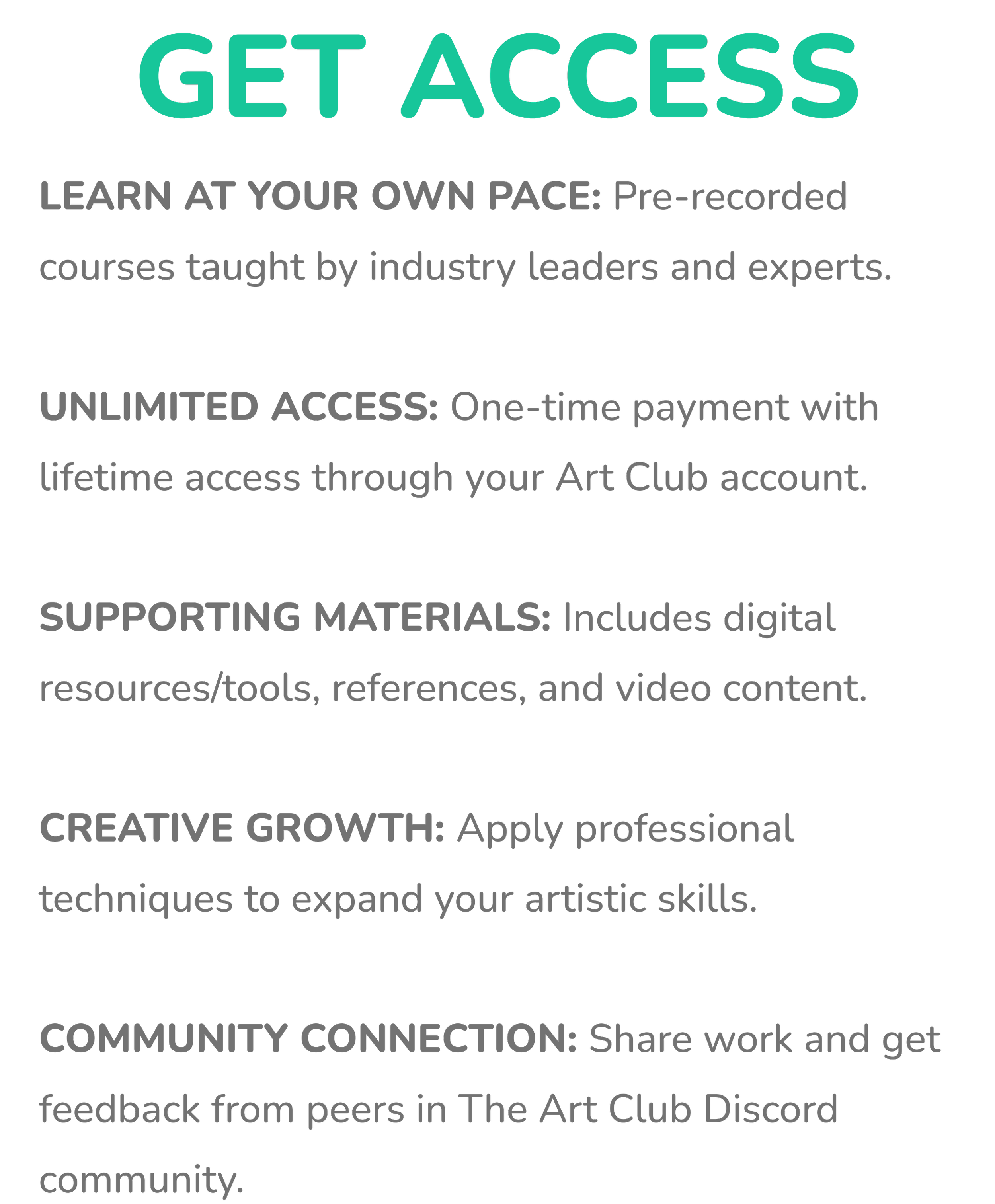 Stay up to date on upcoming events, quarterly creative challenges, and new workshop offerings. Engage with a vibrant community of fellow students, faculty, and industry professionals. Share your work, receive feedback, and grow as an artist alongside others in The Art Club community.